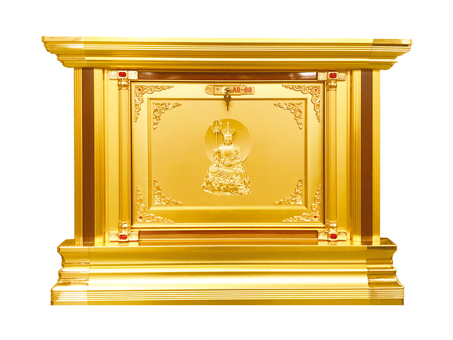 骨灰存放架是由箱體、面板、側板、頂蓋、底座、轉角、封板等構成,以及佛臺、掛落、佛 龕等相關配件構成。 箱體:分鍍鋅板、不銹鋼板、鋁板等五金板材箱體,鋁合金中空板扣接式箱體和純鋁壓鑄型 箱體。 面板:面板根據工藝不同、材料不同,風格各異、大不相同,既要起到美觀易分類作用,又 要起到防火、防塵、防潮、防蟲等作用。 側板:用于裝飾和保護箱體側面的作用,又可根據現(xiàn)場,對存放架分類的標識作用,一目了 然方便管理。 頂蓋、底座:都是穩(wěn)固整列和整排箱體水平線,底座還起到一部分承重作用。 轉角、封板:箱體轉彎處和空隙處塑形的作用。 佛臺:由幾個骨灰存放架組成一個小型佛龕臺,用于放置佛像。 佛龕、掛落:整排存放架為了劃分區(qū)域,在每個區(qū)域靠墻上方,設置小型佛龕,為了美觀, 加上掛落。